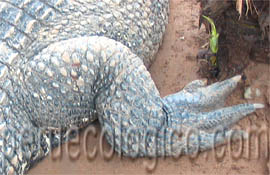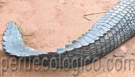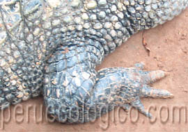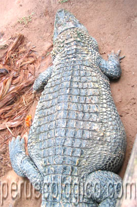 ![]() El portentoso caimán negro es un acorazado viviente. Es considerado el rey de los ríos y cochas amazónicas, debido a su gran tamaño y fiereza. ![]() Sus patas traseras son más fuertes y le permiten impulsarse fuera del agua para atrapar a sus presas. Están compuestas por 4 dedos con membranas interdactilares, que le permiten nadar con rapidez. |