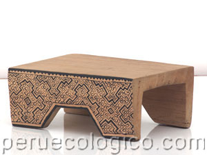 Es un asiento hecho con madera pintada a mano. Sus dibujos reflejan el simbolismo mágico de los Shipibo-Conibo, quienes sostienen que nuestro mundo de apariencias es un espejo del mundo sobrenatural o celestial.