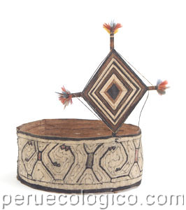 Es un gorro ceremonial masculino tejido en algodón silvestre, pintado a mano, elaborado con fibra de caña brava y coloridas plumas de guacamayo. El maiti está diseñado con figuras geométricas y serpenteantes líneas que representan la boa cósmica.