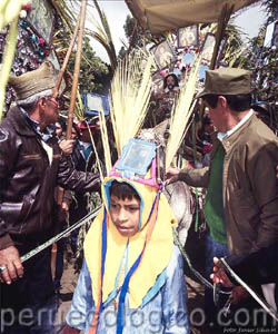 los 3000 y 3800 msnm. Este lugar está enmarcado en una hermosa campiña donde se estableció la etnia cañari en calidad de mitimae, por órdenes del Inca Tupac Yupanqui. La fiesta de las Cruces de Porcón es un ceremonial religioso donde la imagen del Señor de Ramos es colocada sobre una burra o "señorca", quien se encarga de pasearla por todo el pueblo. La "señorca" está sujeta con cuerdas que son guiadas por "ángeles" vestidos de turquesa, amarillo y rosado, que junto a los otros personajes pasan desapercibidos entre las grandes, brillantes y multicolores cruces. |